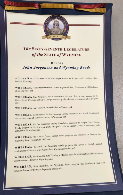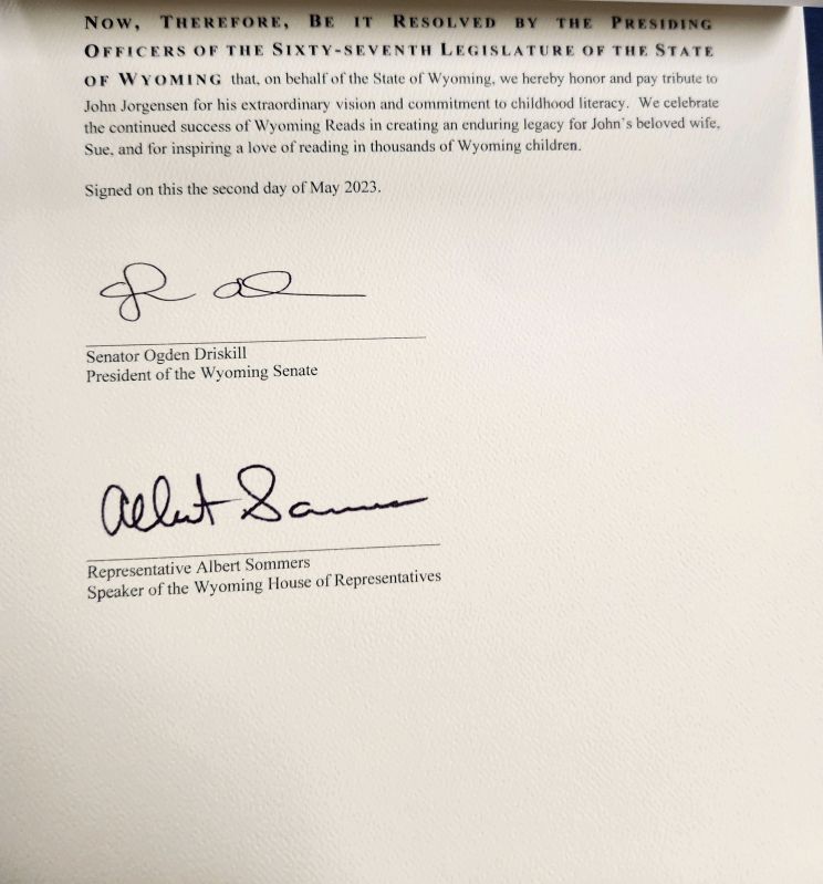 At the end of Wyoming Reads in May 2023, State legislators Art Washut, Steve Harshman, and two others presented John with a proclamation. Mr. Washut will be presenting a bill to the Legislature in January 2024 to make the third Tuesday in May “Wyoming Literacy Day,” a state holiday. Check out the proclamation below!
